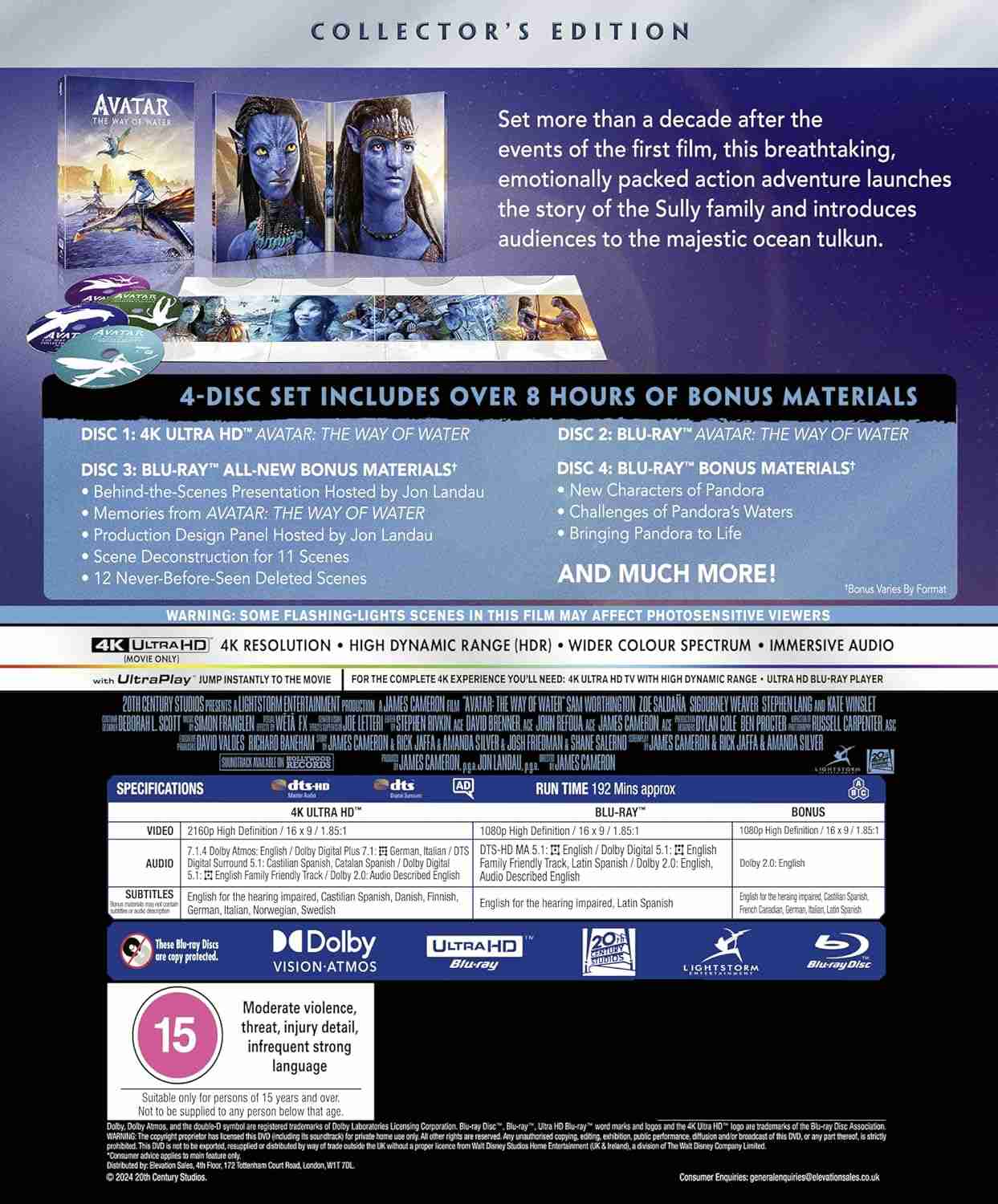 Toto dechberoucí, emocemi nabité akční dobrodružství, odehrávající se více než deset let po událostech prvního filmu, přináší příběh rodiny Sullyových a představuje divákům majestátní oceánské tulkuny. Film byl vylepšen na úchvatný obraz 4K Dolby Vision HDR a pohlcující zvuk Dolby Atmos. 4disková sada obsahuje 8 hodin bonusového materiálu, včetně 5 hodin nových bonusů...