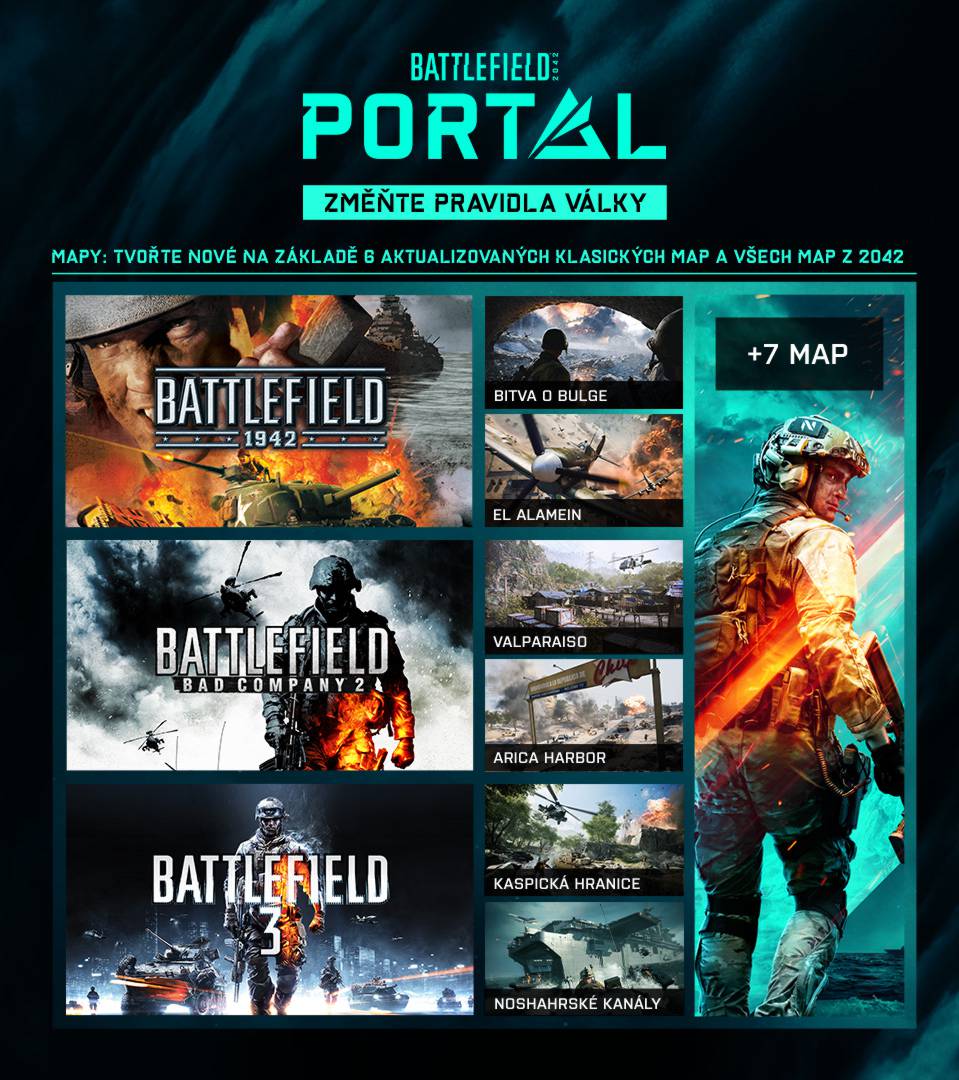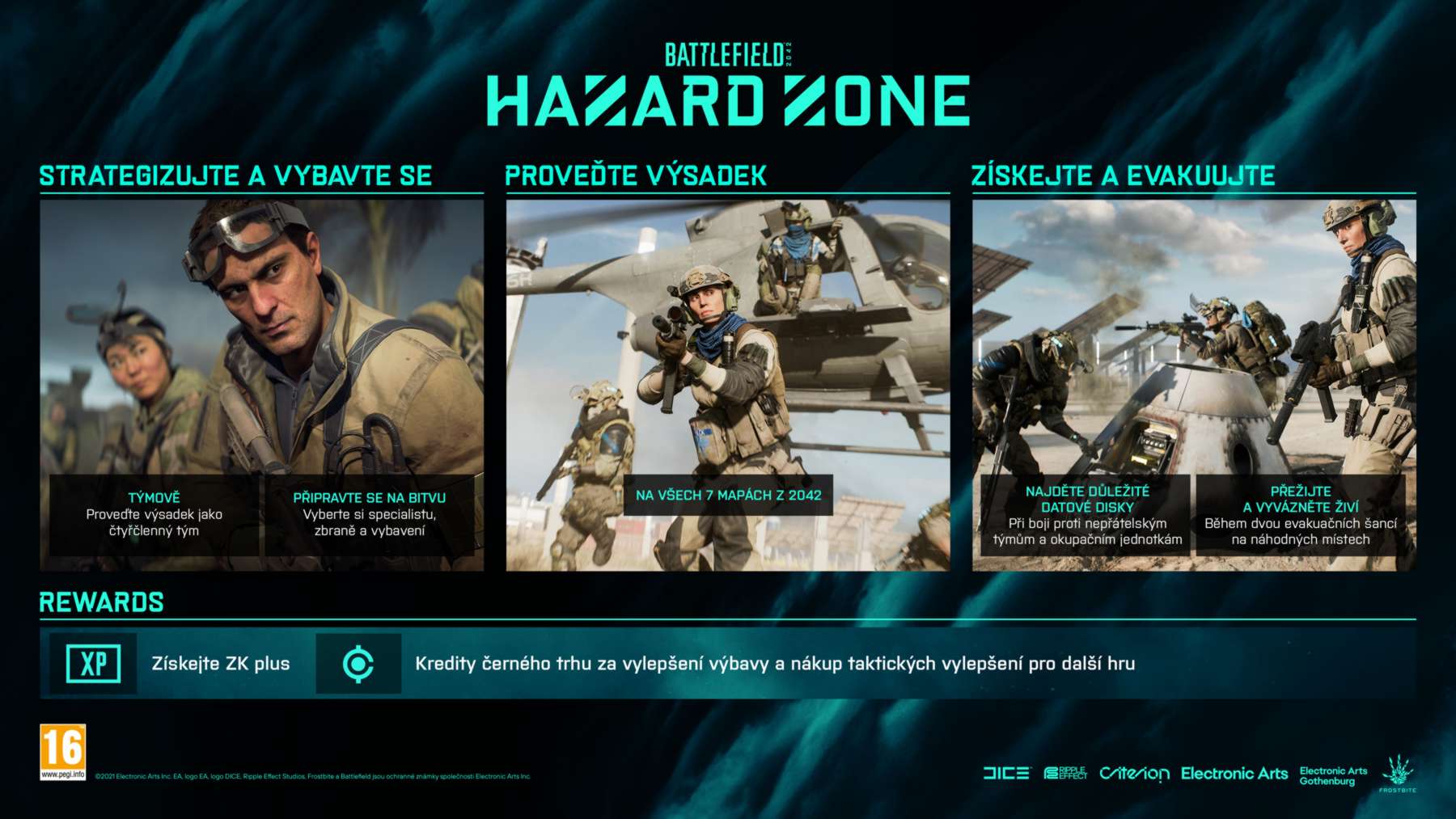 Čekají vás úchvatné zážitky v aktualizovaných režimech pro více hráčů, jako jsou Conquest a Breakthrough, nebo v úplně novém režimu Hazard Zone. Svět, který proměnily nepokoje V roce 2042 extrémní klimatické události a konflikty kvůli zdrojům zcela změnily globální rozložení sil. Spojené státy a Rusko stojí na pokraji války, zatímco váleční veteráni všemožného původu tvoří nezávislé skupiny známé jako jednotky Task Force. Bojujte o budoucnost na tomto dosud nevídaném válečném poli. Až 128 hráčů současně Vůbec poprvé v historii série Battlefield se může do totální války zapojit 64 hráčů najednou. Tento kolosální počet hráčů přináší zcela nové herní příležitosti a velkolepé „battlefieldovské“ momenty. Víc než kdykoli dřív můžete zažít intenzitu masivních bitev, v nichž se může stát cokoliv. Rozsáhlá a dynamická prostředí Intenzivněji prožijte velkolepou válku v obrovském měřítku na sedmi masivních mapách, které odráží novou filosofii designu. Každé bojiště má několik různých bojových zón zasazených do jednoho herního prostoru, a tento extra prostor s sebou přináší větší rozmanitost a významnější zapojení bojové techniky do hry – tanky mají víc prostoru k projetí, stíhačky mají víc vzdušného prostoru k manévrování. Na těchto mapách vás čekají neustále se měnící bojové podmínky a výzvy. Přizpůsobujte se za pochodu dynamickým událostem a katastrofám jako jsou písečné bouře v katarských pouštích, start rakety z vesmírného centra ve Francouzské Guyaně nebo tornáda ohrožující betonové džungle Jižní Koreje. Prvotřídní arzenál Popusťte uzdu své bojové kreativitě s širokou nabídkou nejmodernějších zbraní, vozidel, letounů, vrtulníků a nového vybavení inspirovaného blízkou budoucností roku 2042. Přivolejte Rangera, robotického psa určeného k boji, injekční pistolí oživte členy týmu na dálku, dostaňte se na nová místa pomocí lezeckých háků, oblečte si kombinézu s křídly, využijte průzkumný dron a mnoho dalšího. Specialisté V novém systému specialistů si vyberte roli na bojišti a utvořte vlastnoručně sestavené týmy. Podobně jako čtyři třídy v Battlefieldu i specialisté mají jednu unikátní specializaci a vlastnost, ale zbytek lze kompletně přizpůsobit. Výběrem a vybavením specialisty se budete doplňovat s dalšími členy družstva a získáte schopnosti obstát v každé bojové situaci.